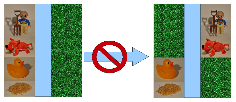 This didn't work out too well, the goose was left unattended to feast on the grain - game over, we lost. Even though we lost the game, the representation has exposed an important constraint that might be obvious to us humans but must be explicitly stated for an Ai farmer, things that eat each other cannot be on the same side of the river without the farmer also being there. Our representation is serving us well so far, it has exposed constraints that we can exploit to solve the problem. The constraint shows which state transitions are valid and which ones are not: