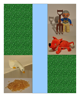 This representation looks promising as it makes explicit which side of the river everyone is on, lets see if we can use it to make progress with the puzzle. We did not mention it earlier but to get across the river the farmer must take the other across in a boat that has only room for two. What happens if our robot farmer takes whatever happens to be nearest to him across the river, in this case that is the fox: